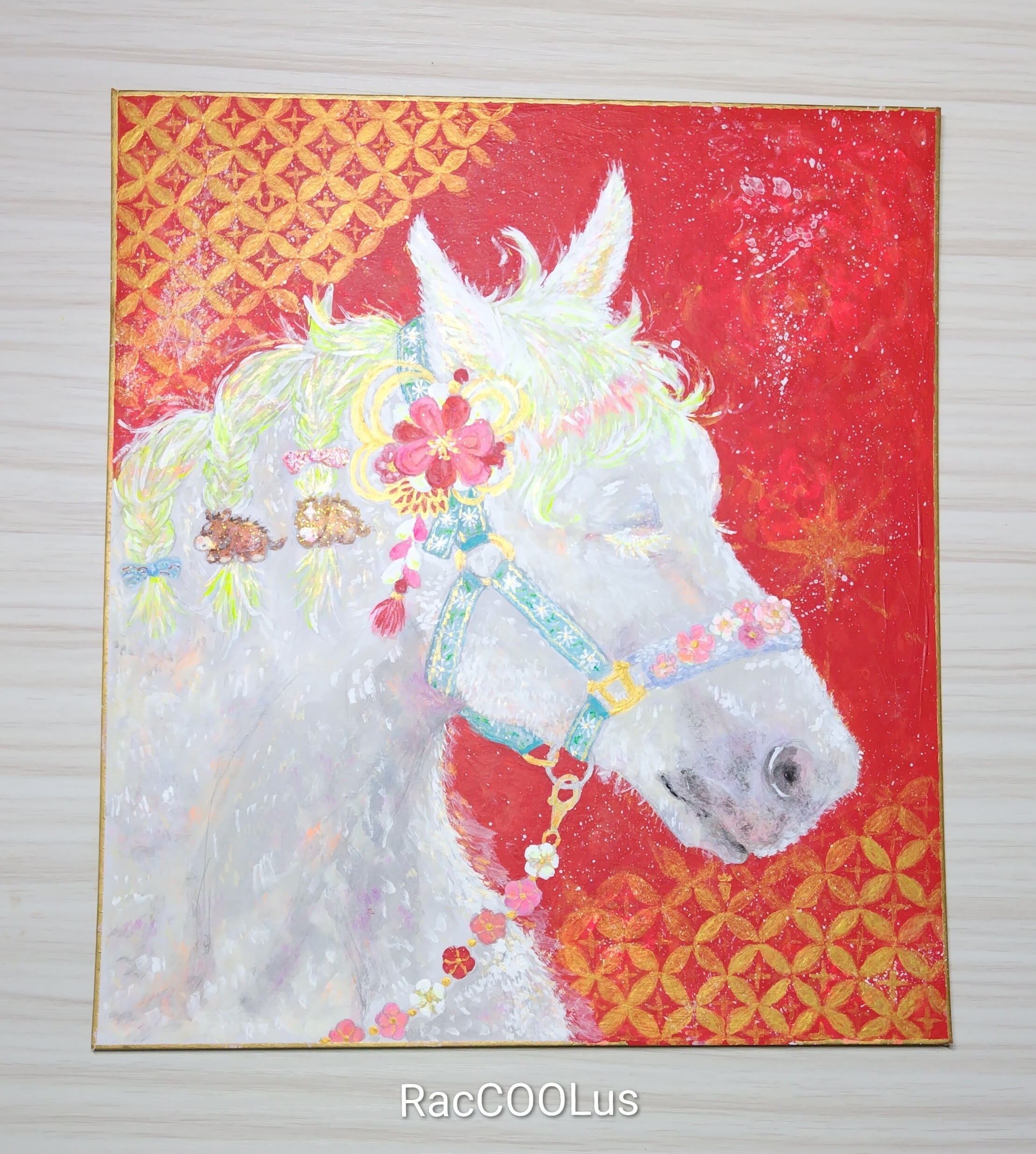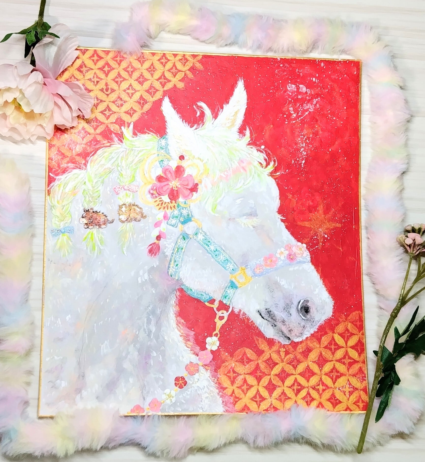 ちりめん細工やつまみ細工の花、金の絵の具による破れ七宝模様で和を表現しつつ、インド刺繍をイメージしたデザインを取り入れた無口、蛍光アクリル絵の具で可愛らしくメルヘンな色合いに、ラメのアクリル絵の具やゴールドで光による画面の変化が楽しい作品となっております。